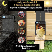 BEZPEČNÉ PRO SLEPICE:Vestavěný senzor zastaví zavírání dveří, když detekuje překážku, a zabrání tak poranění slepic. Systém proti rozdrcení zajišťuje bezpečnost vašich slepic.