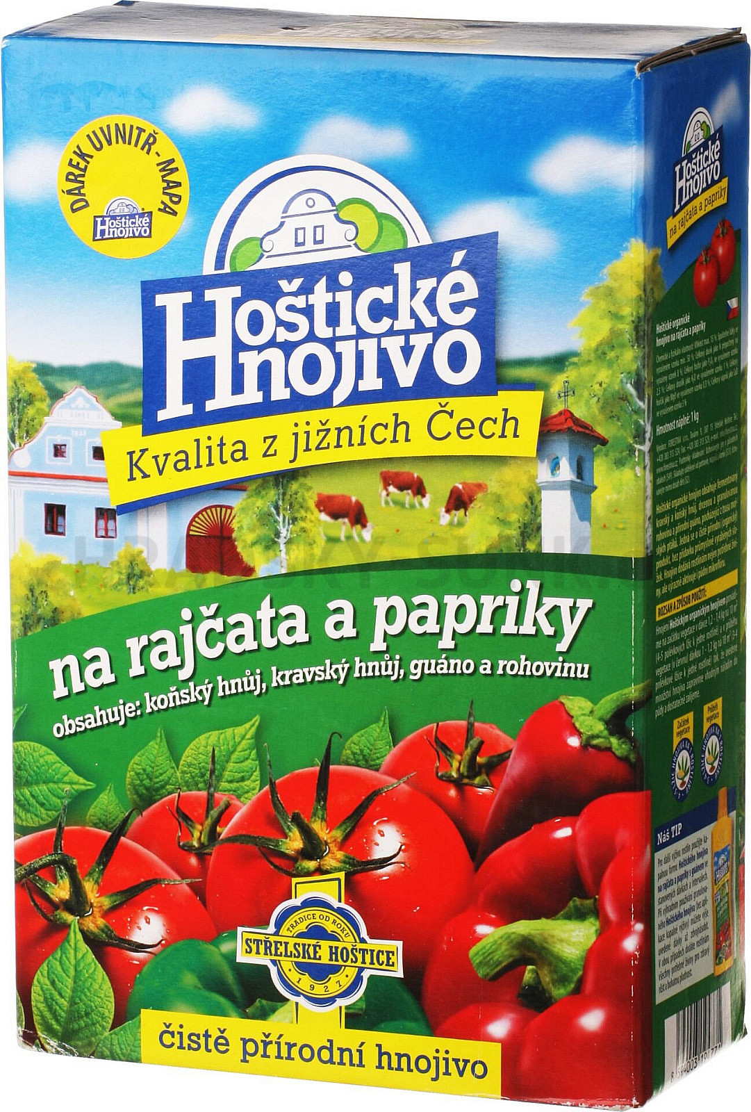 Hoštické organické hnojivo na rajčata a papriky obsahuje fermentovaný kravský a koňský hnůj, drcenou a granulovanou rohovinu a přírodní guáno, pocházející z trusu mořských ptáků. Jedná se o čistě přírodní produkt, bez přídavku průmyslově vyráběných složek. Hnojivo dodává nejen potřebné živiny, ale výrazně aktivuje i půdní mikroflóru.