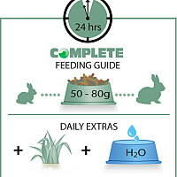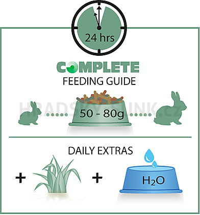 Podle velikosti, rasy a věku králíka je průměrná denní porce od 50 do 80g. Vyměňujte každý den krmení i vodu. Dopřejte ašemu králíkovi vždy dostatek sena.
