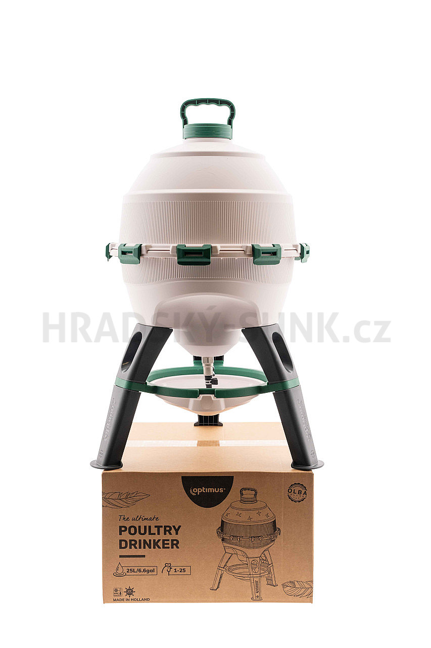 OPTIMUS® je prémiová sifonová napáječka pro každého, kdo chce svým kuřatům neustále poskytovat čistou a čerstvou pitnou vodu. Díky robustní konstrukci zůstává napáječka stabilní i při plném naplnění. OPTIMUS® je také navržen s ohledem na pohodlí: snadno se používá, snadno se čistí a je vhodný pro vnitřní i venkovní použití. S objemem 25 litrů je OPTIMUS® ideální až pro 25 kuřat nebo 20 slepic a perfektní pro každodenní použití v jakémkoli kurníku nebo výběhu.
